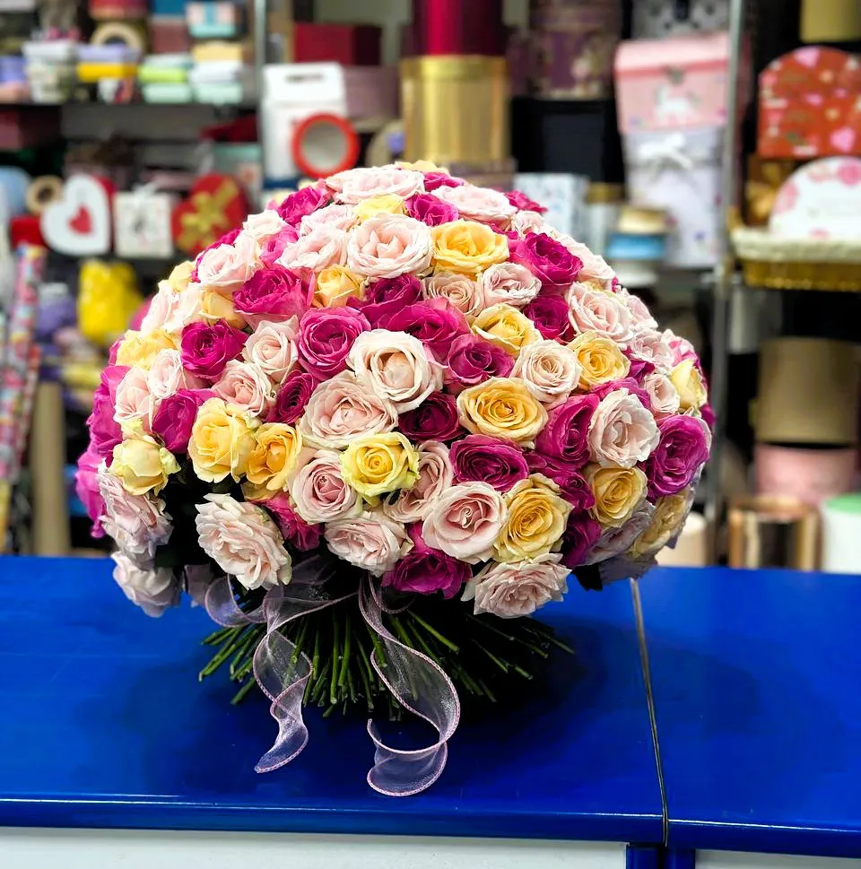 Выбирая букет из 101 разноцветной розы, вы дарите не просто цветы, а целое море чувств и положительных эмоций, которые наполнят сердце теплом и радостью. Создайте незабываемые моменты и подчеркните важность тех, кого вы любите, с помощью этого великолепного букета!