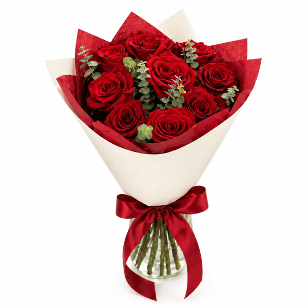 Букет из 9 красных роз с эвкалиптом - это выразительная композиция, в которой классическая романтика встречается с современным стилем. Глубокие алые розы символизируют любовь, восхищение и сильные чувства, а эвкалипт добавляет лёгкость, свежесть и утончённый природный акцент.