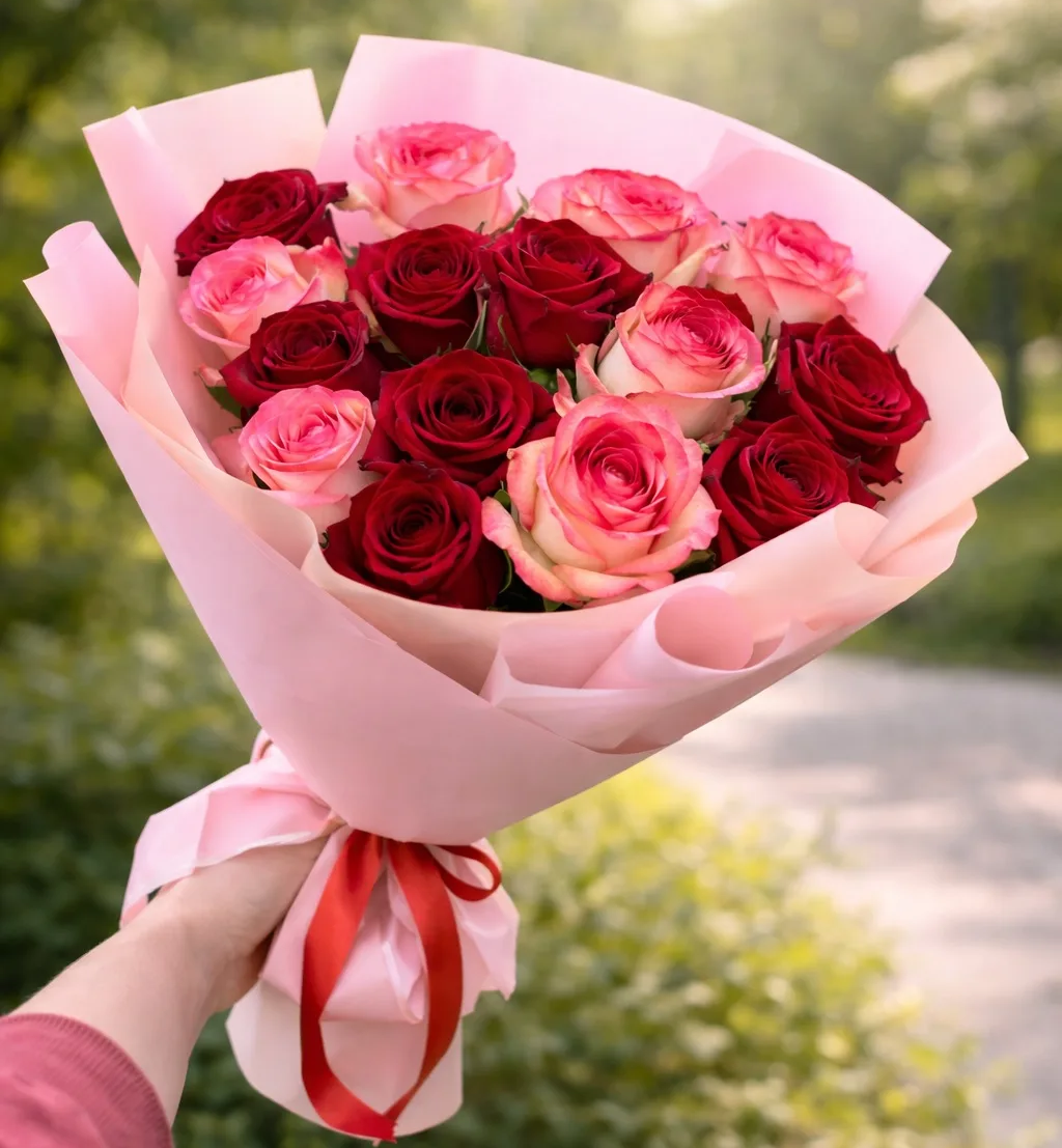 Изысканный букет из роз «Джумилия» с добавлением красных роз в стильной упаковке - гармония нежности и выразительной страсти. Лепестки «Джумилия» с кремовой основой и тонкой розовой каймой создают мягкий, романтичный образ, а насыщенные алые розы добавляют композиции глубину и яркий эмоциональный акцент. Контраст оттенков делает букет живым, элегантным и по-настоящему запоминающимся. Стильная упаковка подчёркивает форму и придаёт композиции завершённый, современный вид. Такой букет идеально подойдёт для особых признаний и значимых моментов.