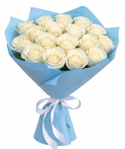 Изысканный букет из 17 белых роз очаровывает своей чистотой и благородной элегантностью. Белоснежные бутоны символизируют искренность, уважение и светлые чувства, создавая гармоничную и воздушную композицию. Голубая упаковка придаёт букету свежесть и мягкое, спокойное настроение.