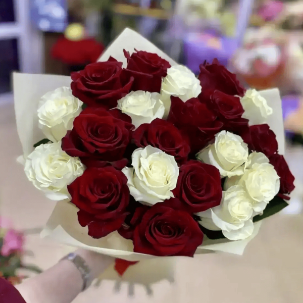 Букет из 21 красной и белой розы - это выразительная композиция, в которой страсть гармонично переплетается с нежностью. Глубокие красные розы символизируют любовь и восхищение, а белые - искренность, чистоту и уважение. Вместе они создают эффектный и запоминающийся дуэт, идеально подходящий для самых важных моментов.