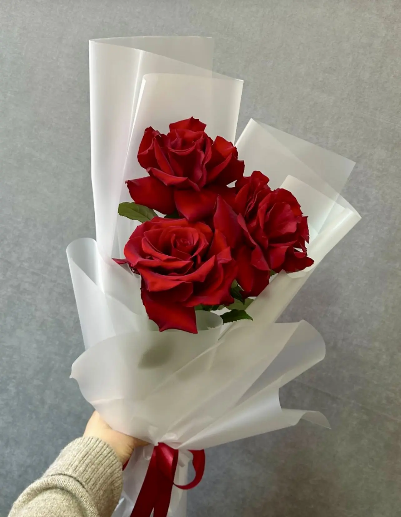Элегантный букет из 3 красных французских роз в стильной упаковке - утончённое сочетание страсти и изысканной формы. Пышные, многолепестковые бутоны французских роз выглядят особенно выразительно, раскрываясь мягкими бархатистыми слоями насыщенного алого оттенка. Лаконичная упаковка подчёркивает благородство композиции, делая её современной и гармоничной. Такой букет - идеальный выбор для красивого признания, комплимента или знака особого внимания.