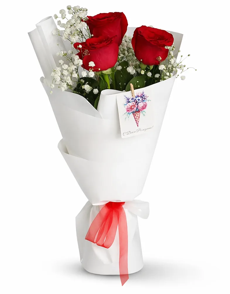 Лаконичный и выразительный букет из трёх красных роз, дополненный нежной гипсофилой, создаёт гармоничное сочетание страсти и лёгкости. Алые розы притягивают взгляд своей глубиной и символизируют искренние чувства, а воздушная гипсофила придаёт композиции мягкость и романтичное настроение.