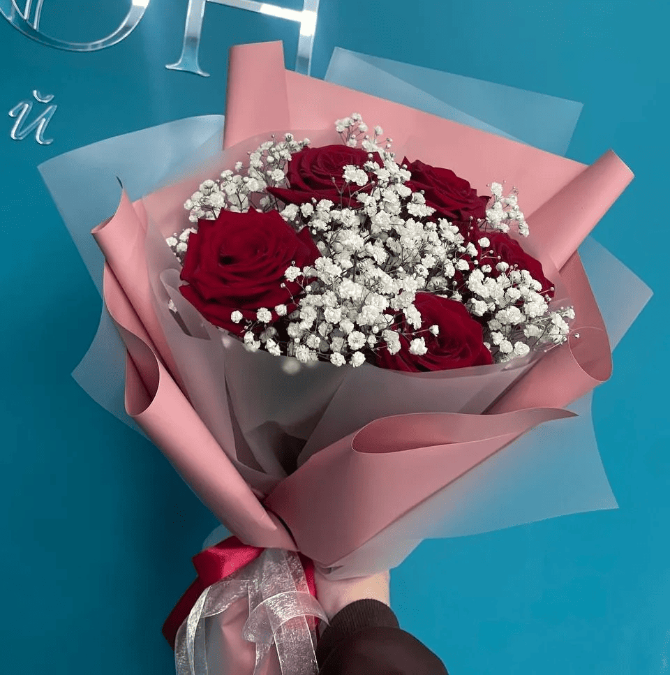 5 роз, гипсофила, упаковка
