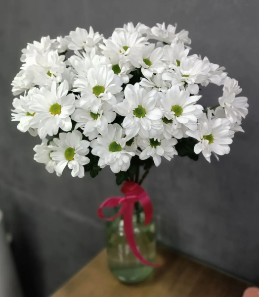 Лёгкий и нежный букет из 5 ромашковидных хризантем очаровывает своей простотой и естественной красотой. Минималистичная композиция выглядит свежо и уютно, наполняя пространство теплом и искренними эмоциями.