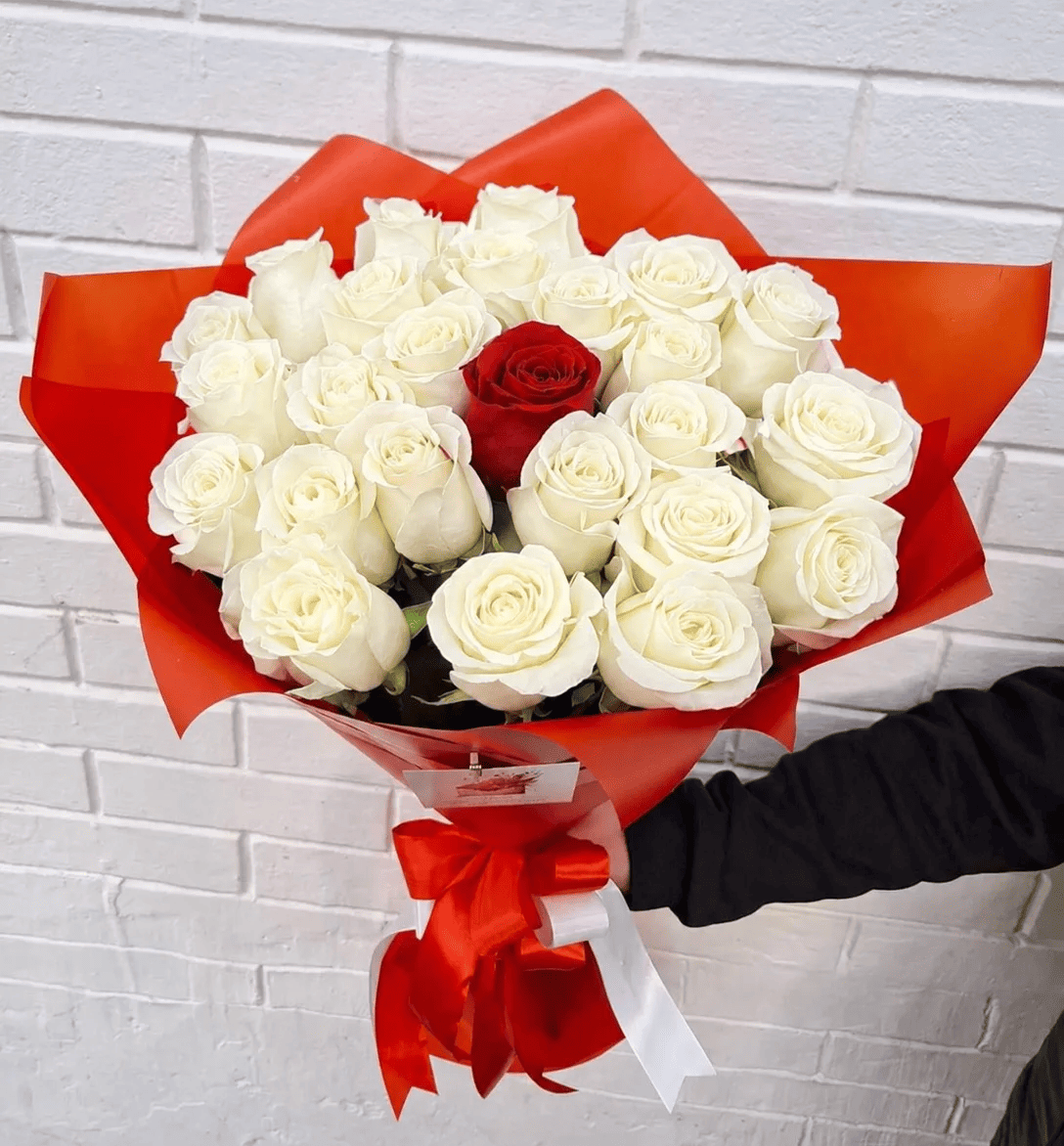Изысканный букет из 24 белых роз с одной красной розой в центре - это утончённая композиция с глубоким смыслом, где нежность встречается со страстью. Белоснежные розы символизируют чистоту, искренность и светлые чувства, а яркая красная роза в центре становится выразительным акцентом любви, восхищения и особенного отношения.