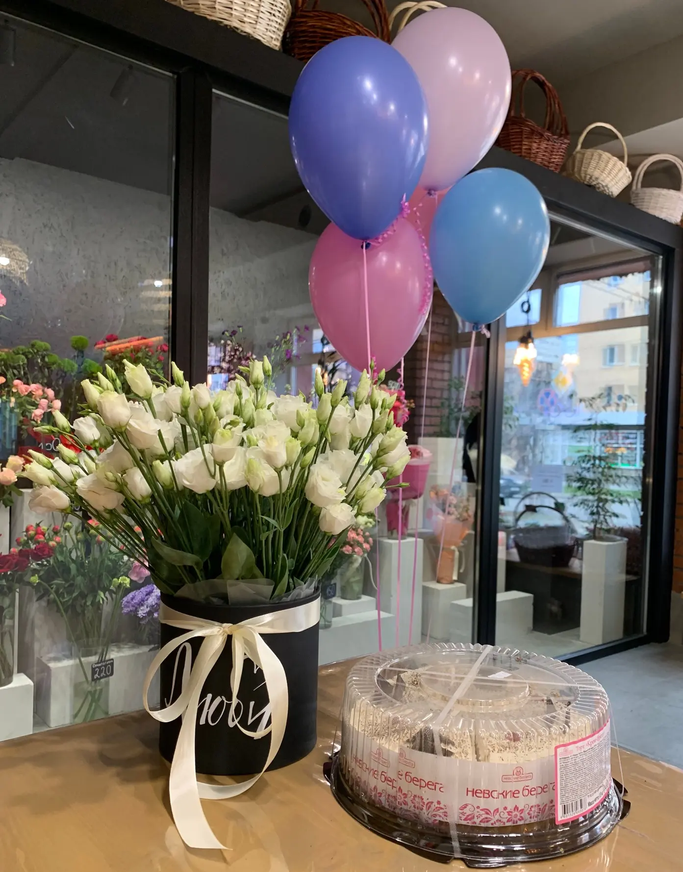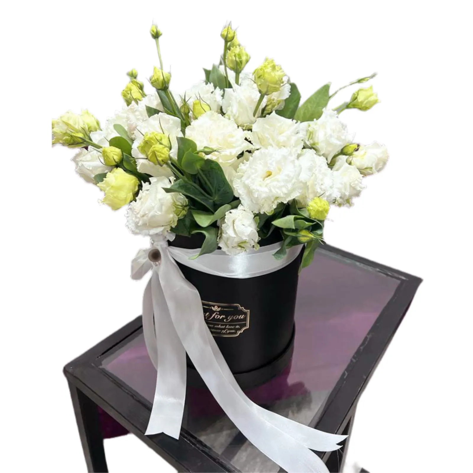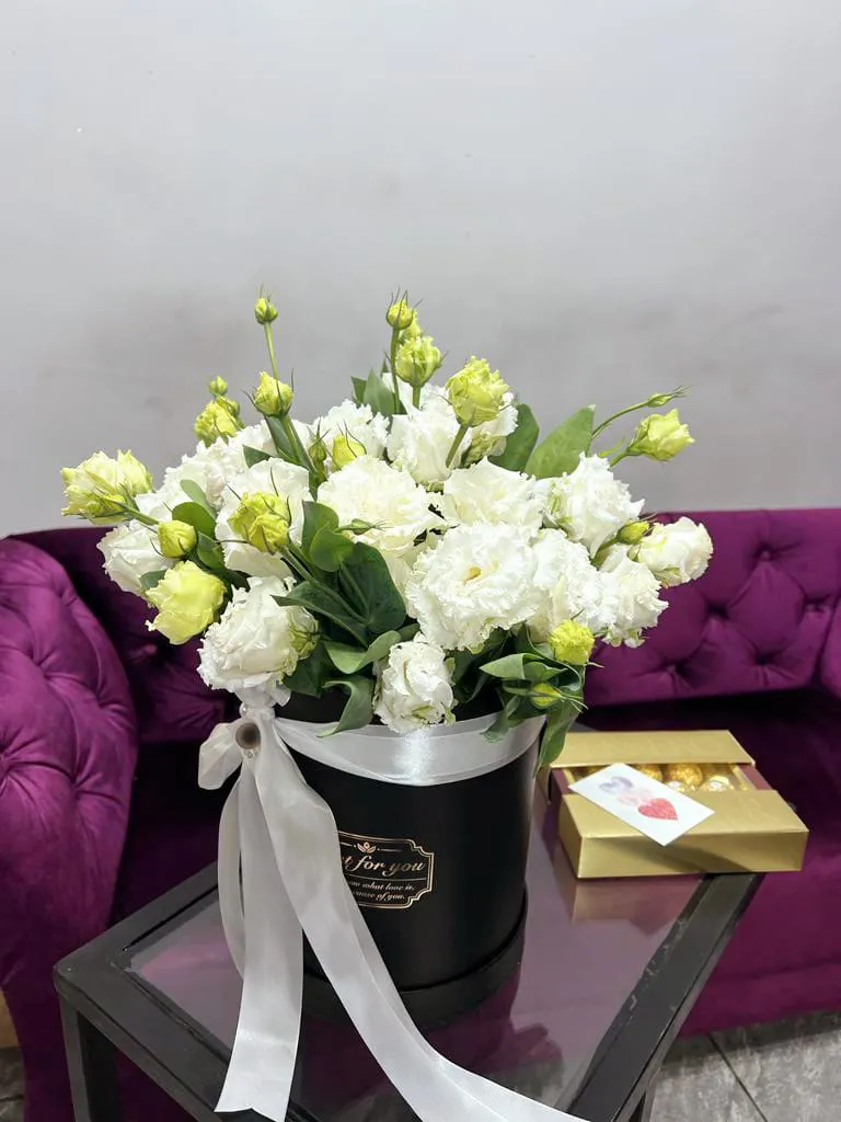 эустома, оазис, шляпная коробка |