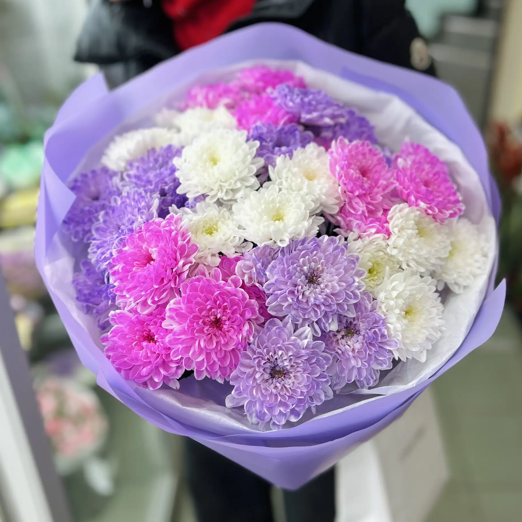 Белые хризантемы символизируют искренность и чистоту, розовые - заботу и тёплые чувства, а фиолетовые добавляют букету глубину и выразительность. Вместе они создают живой, многогранный ансамбль, который радует глаз и поднимает настроение.