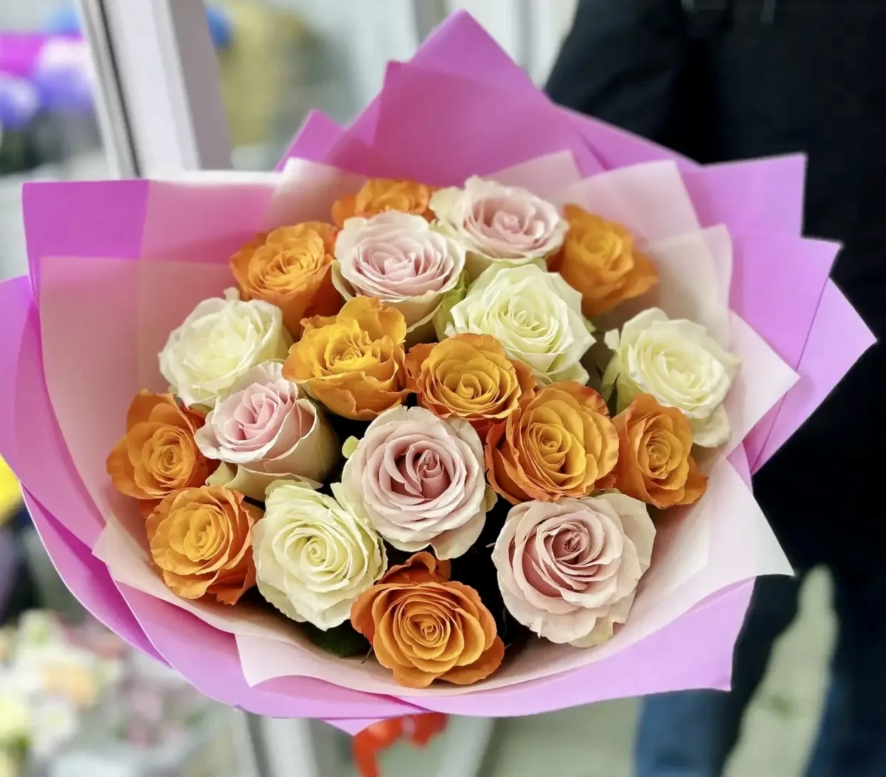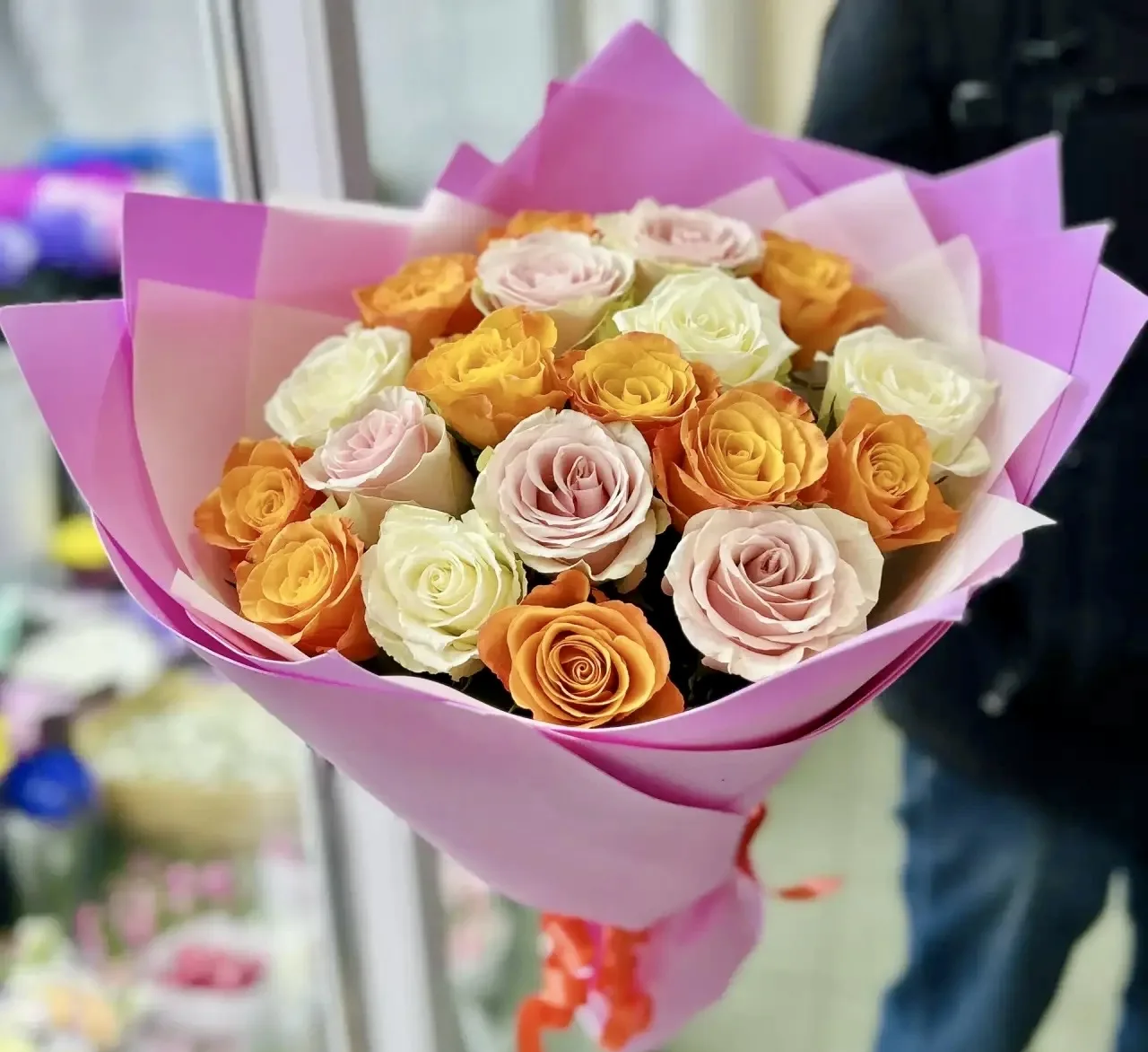 Яркий и гармоничный букет из 19 роз в оранжевых, белых и розовых оттенках в стильной упаковке - это настоящий праздник цвета и эмоций.