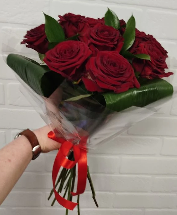 • Стандарт - роза - 9 шт, зелень, упаковка, лента