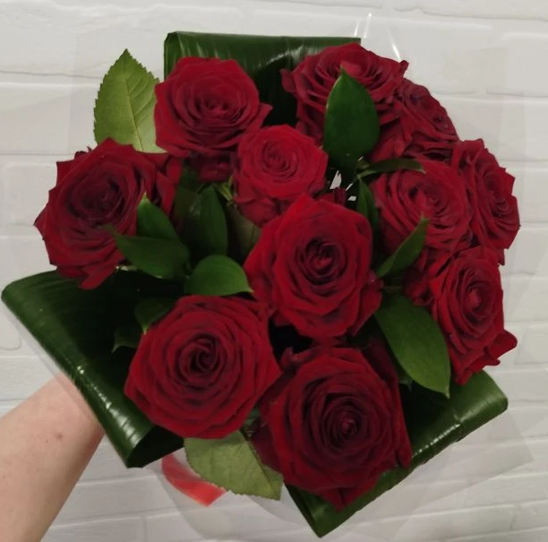 • Средний - роза - 11 шт, зелень, упаковка, лента