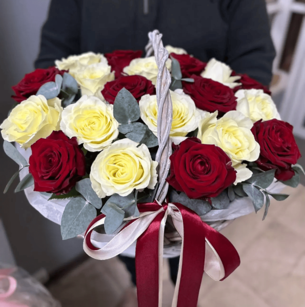 Плетёная корзина придаёт цветам особый шарм и делает подарок стильным, удобным и полностью готовым к вручению. Такая композиция станет прекрасным выбором для дня рождения, юбилея, признания в любви, семейного праздника или торжественного события.