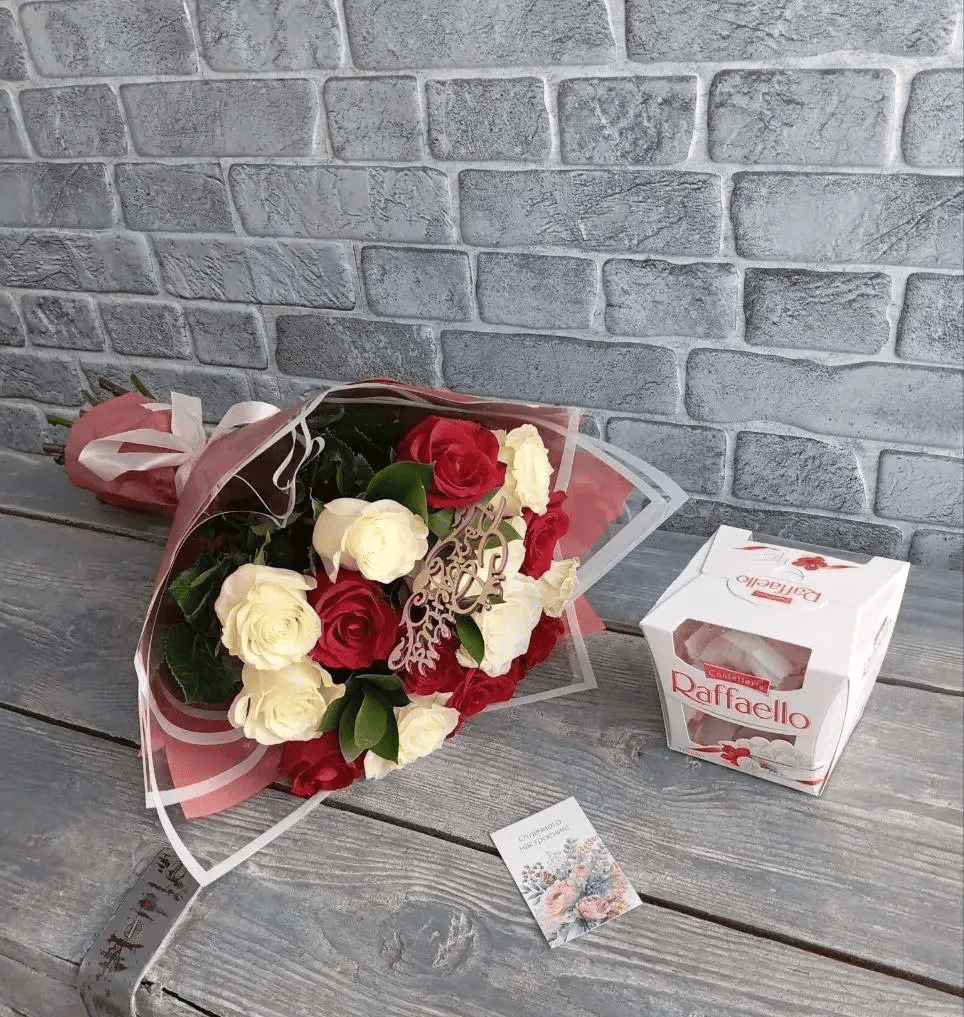 Состав букета: красные и белые розы, зелень,топпер,упаковка,лента