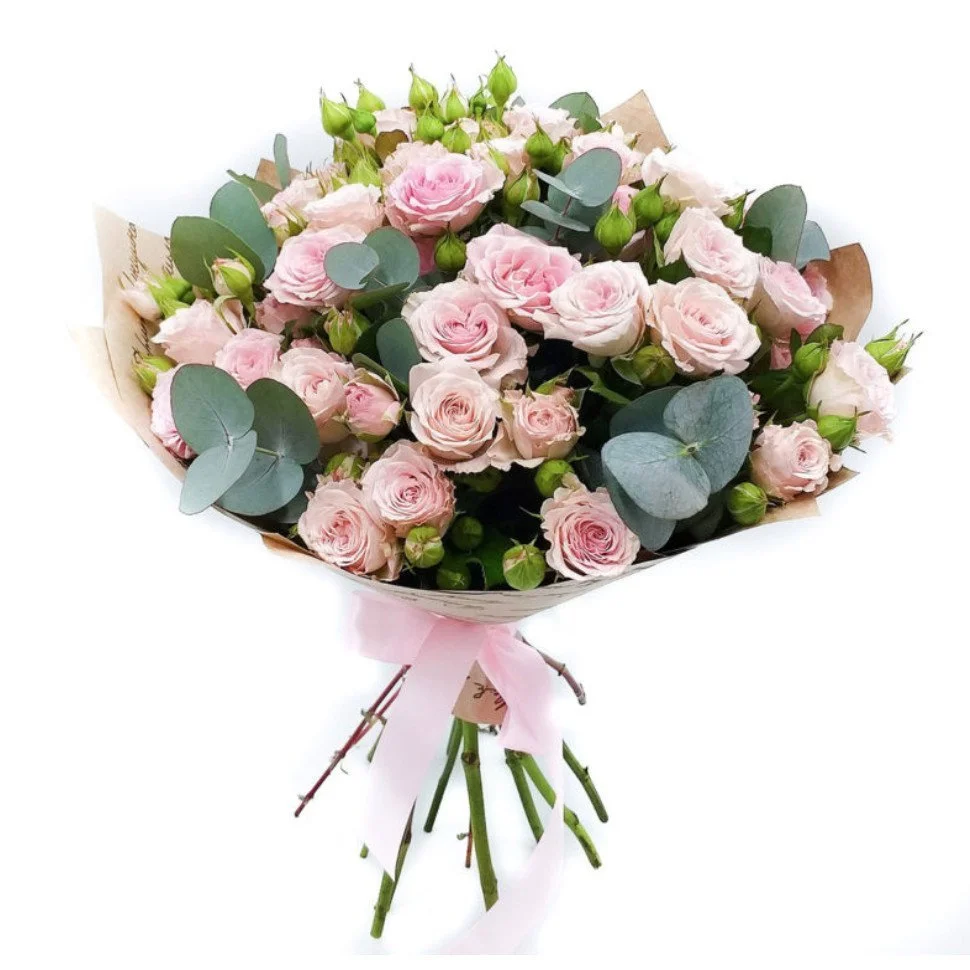 - Средний - кустовая роза - 7 шт., зелень, упаковка, лента