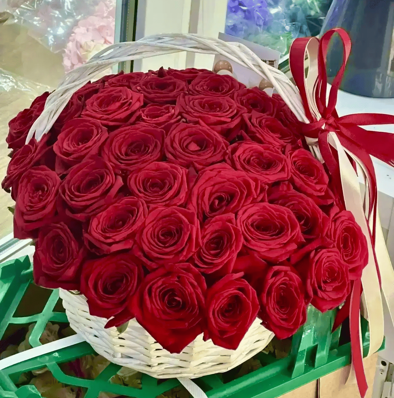 Корзина из красных роз — это воплощение страсти и нежности. Каждая роза, распустившаяся в этом изысканном букете, словно сияет, наполняя пространство своим ярким цветом и насыщенным ароматом. Лепестки, нежно касаясь друг друга, создают гармоничную симфонию форм и оттенков, в то время как густые зеленые листья служат прекрасным фоном, подчеркивающим красоту цветов.