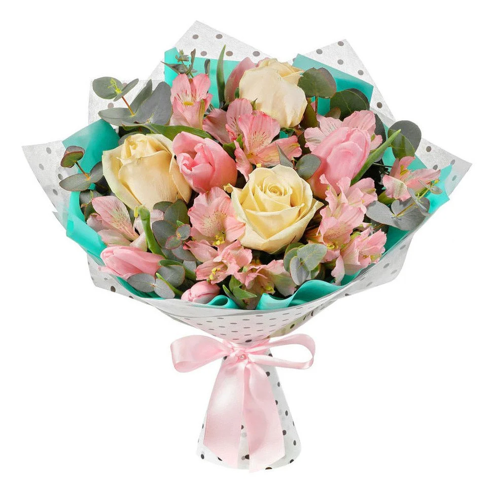 - Средний - роза - 5 шт., альстромерия - 5 шт., тюльпан - 5 шт., зелень, упаковка, лента