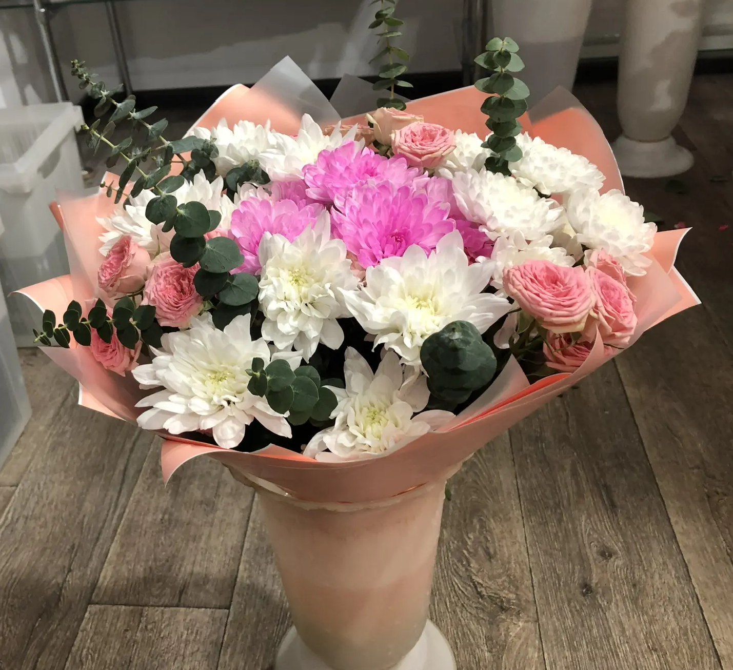 Кустовая хризантема, кустовая роза, зелень, упаковка, лента