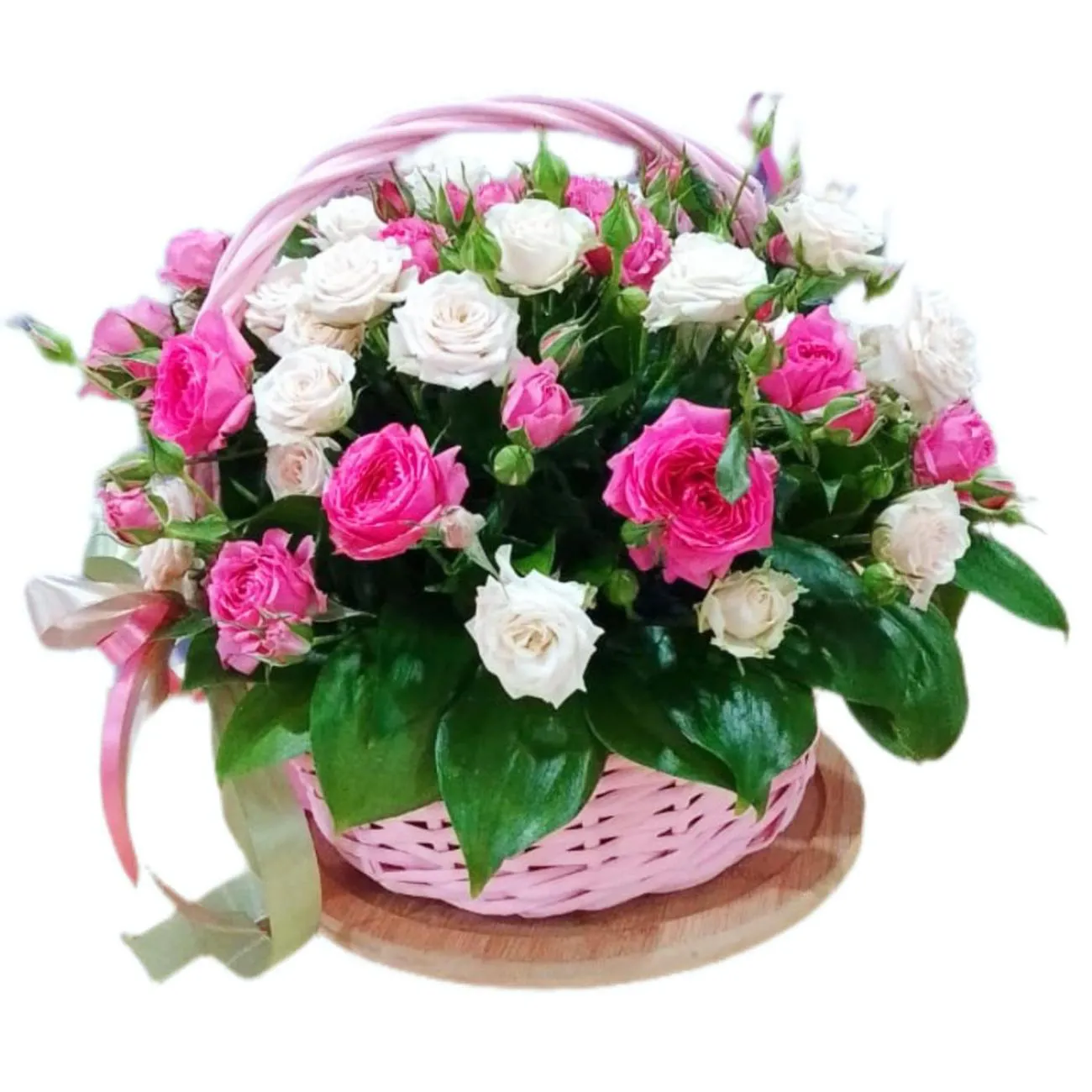 - Премиум( кустовая роза - 25 шт., зелень, оазис, корзина