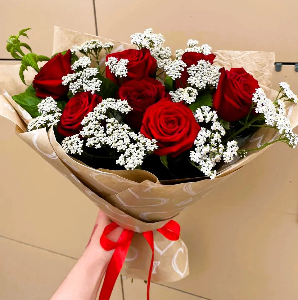 Красные розы, украшенные белыми цветами, создают невероятно красивую композицию, символизирующую любовь и чистоту. Эти яркие цветы идеально подходят для романтических мероприятий, свадеб или как подарок для близких. Красные розы олицетворяют страсть и силу чувств, в то время как белые цветы добавляют нежности и утонченности.