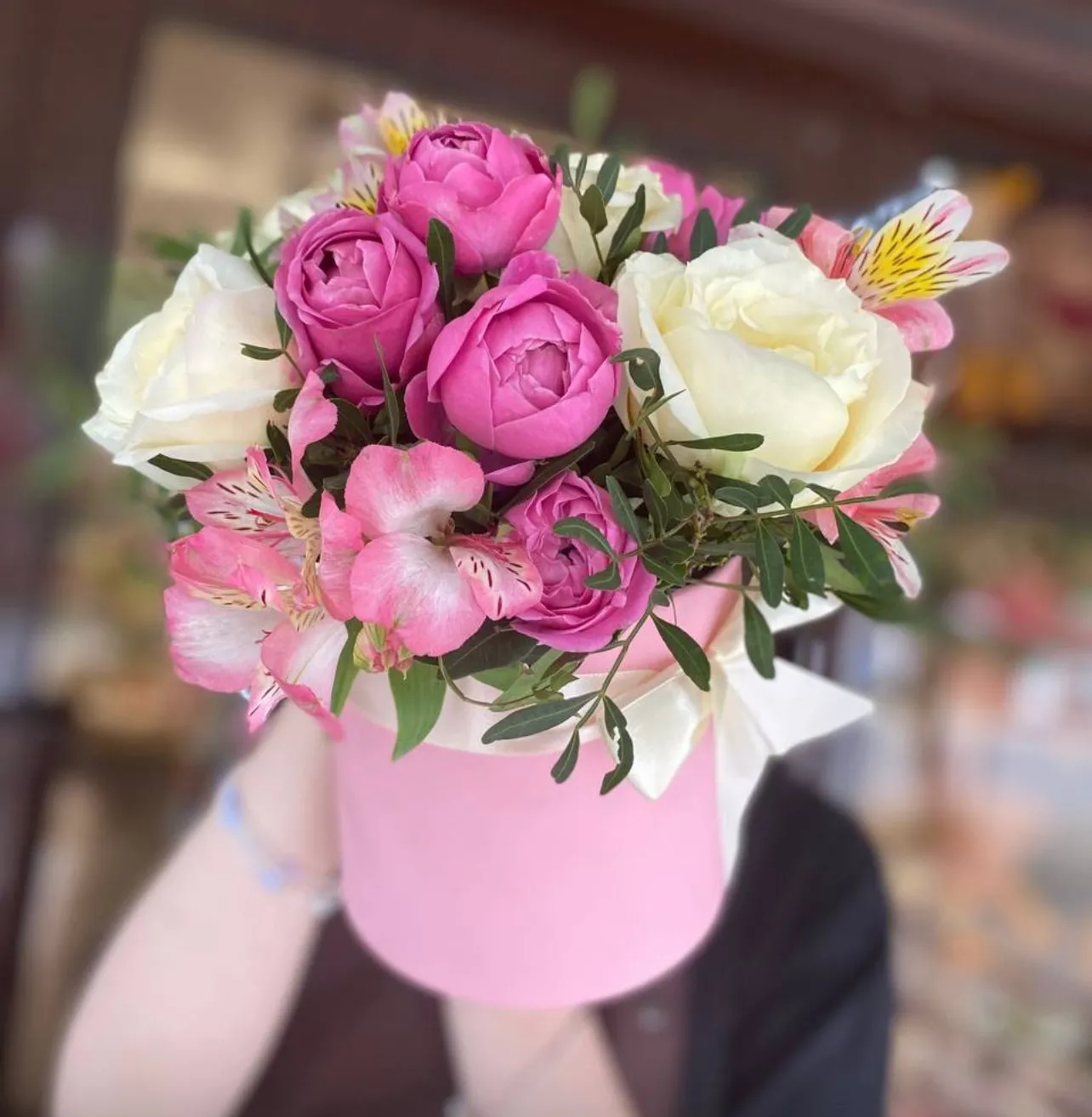 Вся эта нежная палитра цветов собрана в элегантной шляпной коробке, которая придает композиции завершенный, презентабельный вид. Коробка – это не просто упаковка, это стильный аксессуар, который подчеркивает ценность содержимого и делает букет готовым к дарению, не требуя дополнительной вазы.