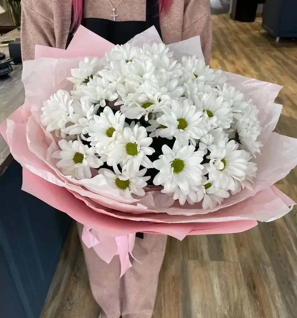 Белые ромашковые хризантемы подарят улыбку и весеннее настроение в любое время года.