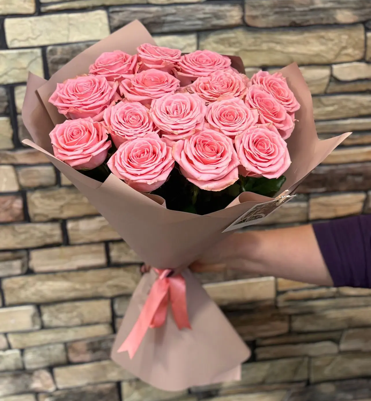 Букет из 15 розовых роз - воплощение романтики, утончённости и тёплых чувств. Подойдёт для признания, комплимента или особенного момента