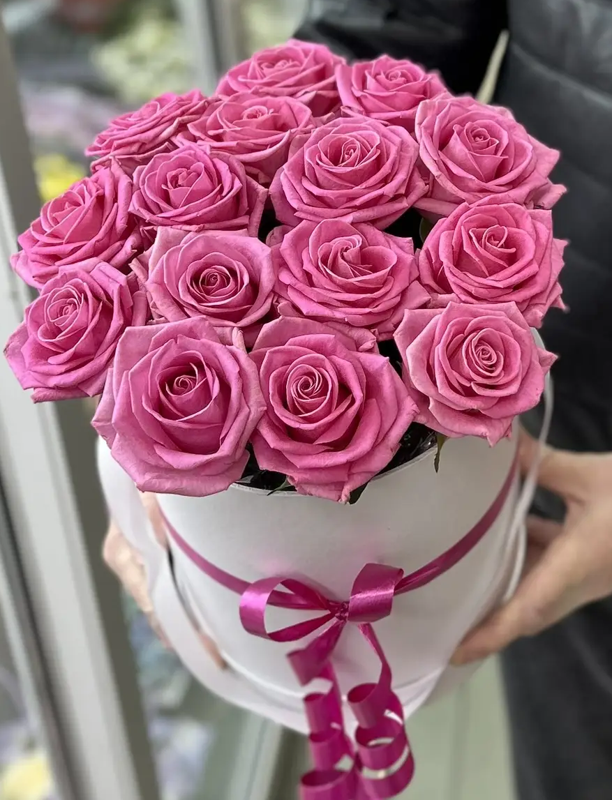 Вариант—Стандарт-15 роз, шляпная коробка, оазис