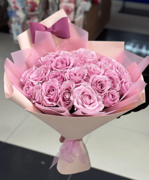 Букет из 25 розовых роз в изысканной упаковке - это воплощение нежности, гармонии и утончённой красоты. Пышные розовые бутоны создают эффектный объём и выглядят по-настоящему роскошно, передавая искренние чувства, восхищение и заботу.